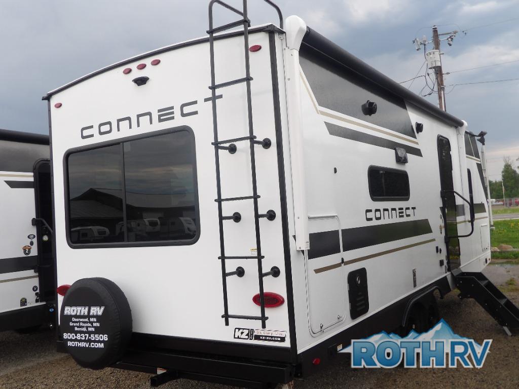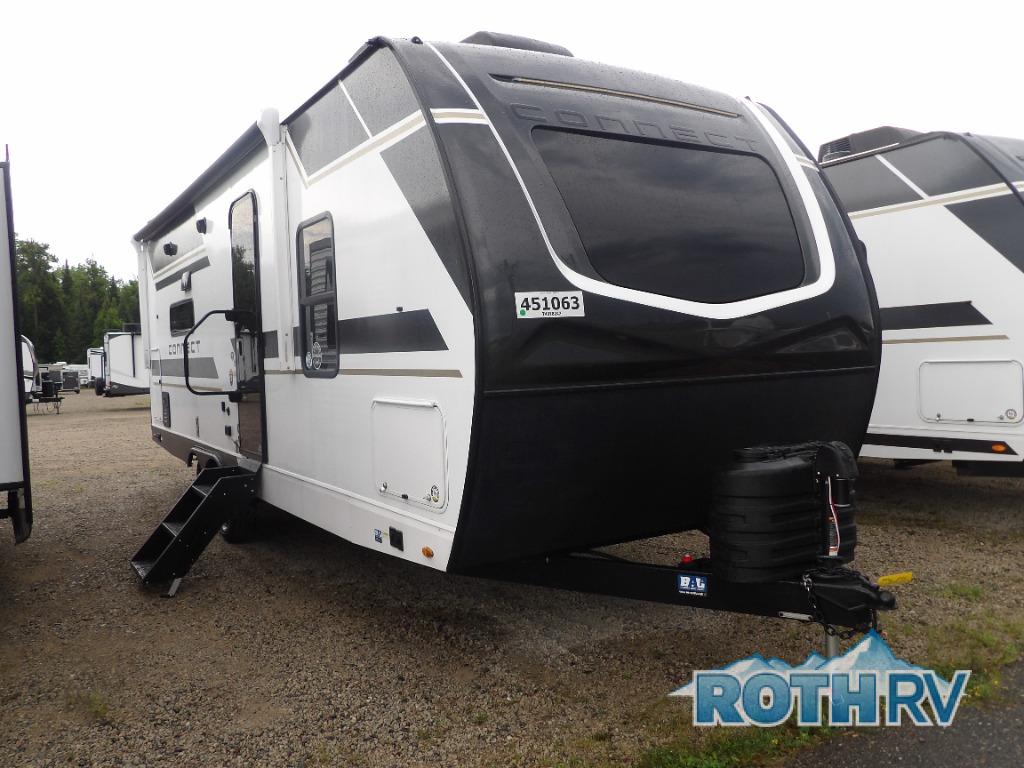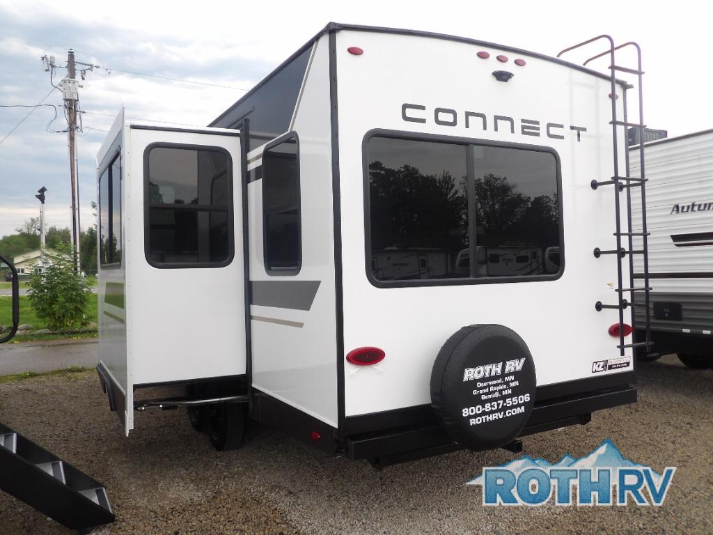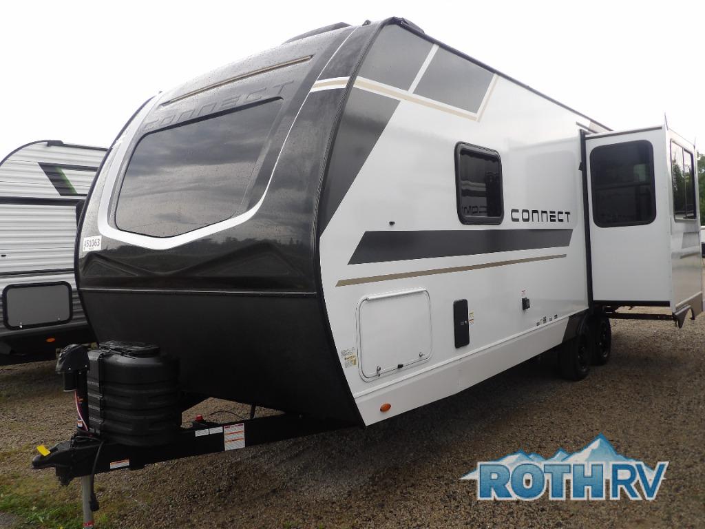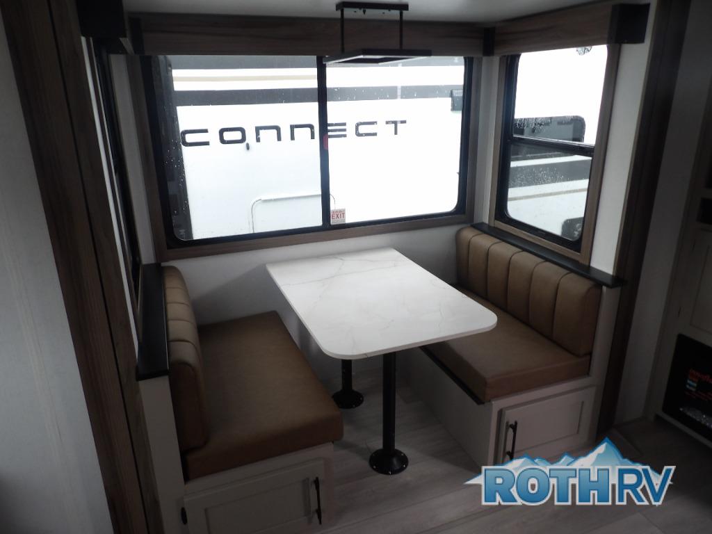 Hitch up this Connect travel trailer and head out for a fabulous weekend away! You will enjoy added space in the living area because of the single slide that holds the booth dinette, and another convenient feature is the dual-entry bathroom that can be accessed from the main hallway or the bedroom. You will be quite surprised to find a king-size bed inside the bedroom, along with dual wardrobes and a TV mount if you want to add a television. A pass-through storage on the exterior allows you to bring along extra gear, and the interior is kept cozy on chilly fall evenings with the 34" fireplace.