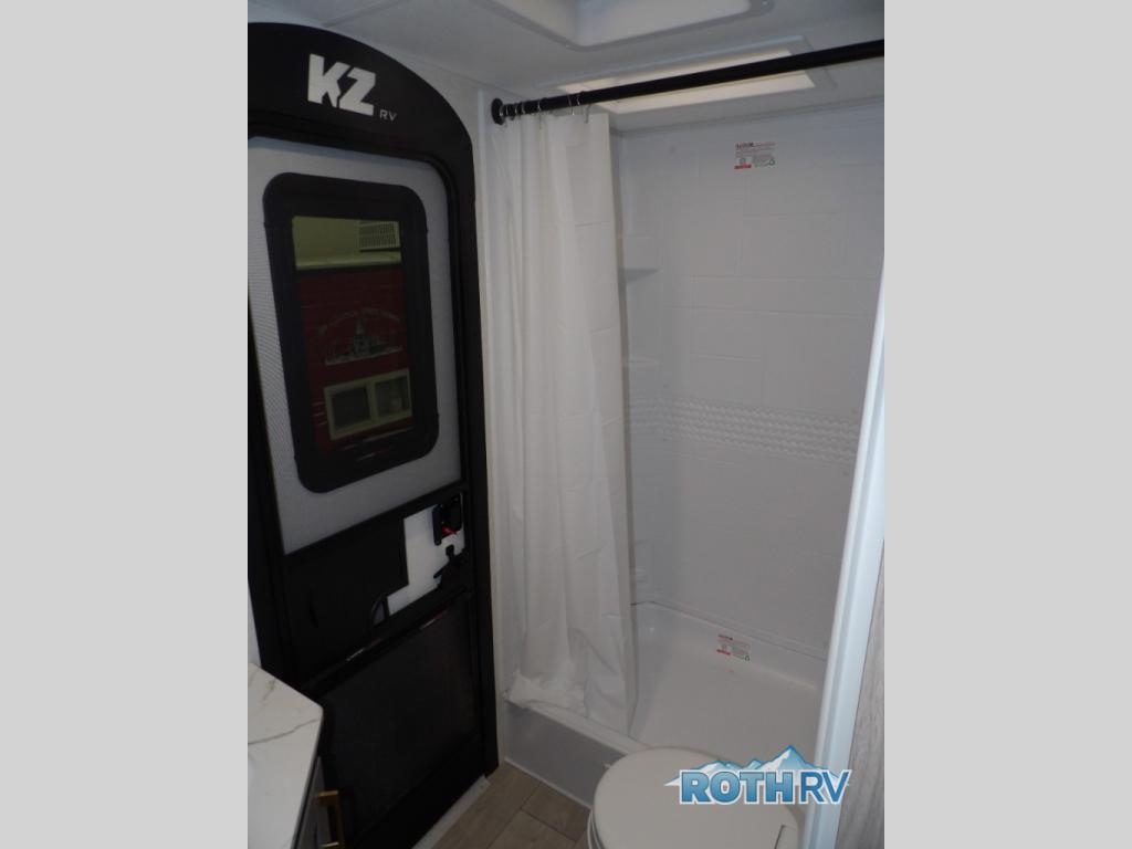 Each Sportsmen SE travel trailer and toy hauler by KZ is constructed with KZ exclusive tough shield exterior metal, a one-piece seamless walk-on Tufflex roofing material, and diamond plate rock guard to protect your unit from road debris. You will appreciate the extra large baggage doors for stowing away your gear when not in use, and tinted windows to help keep the harmful sun rays out plus keeping it cooler inside. Some of the exterior conveniences found in the mandatory Advantage Package are the solid folding steps with a large folding grab handle for easy entry and exit, a full glass friction hinged entry door, plus an exterior shower for your pets or to rinse off before you head inside. You'll also appreciate the nitrogen-filled tires, solar and backup camera prep, plus a Leash Latch with a bonus beverage opener. You'll feel right at home inside with linoleum flooring throughout, a 13,500 BTU air conditioner, large overhead cabinets, a shower surround, and much more!