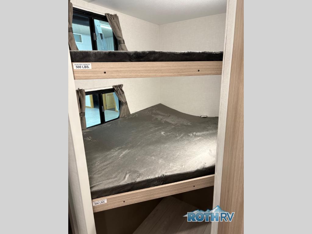 This bunkhouse model is perfect for your whole crew! Your guests or little ones will love the double-size bunks, while you take the queen bed in the front private bedroom. The large slide out will create an open living area, and here you'll find the 80" U-shaped dinette where you can dine, play games, and let guests sleep over. And don't overlook the full bath right next to the bunks for easy nighttime use. There is plenty of storage space in this model, including a pantry in the kitchen, dual wardrobes in the bedroom, an exterior pass-through storage, and even an exterior trunk door under the bunks to easily fit in all your gear!