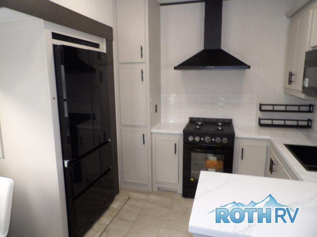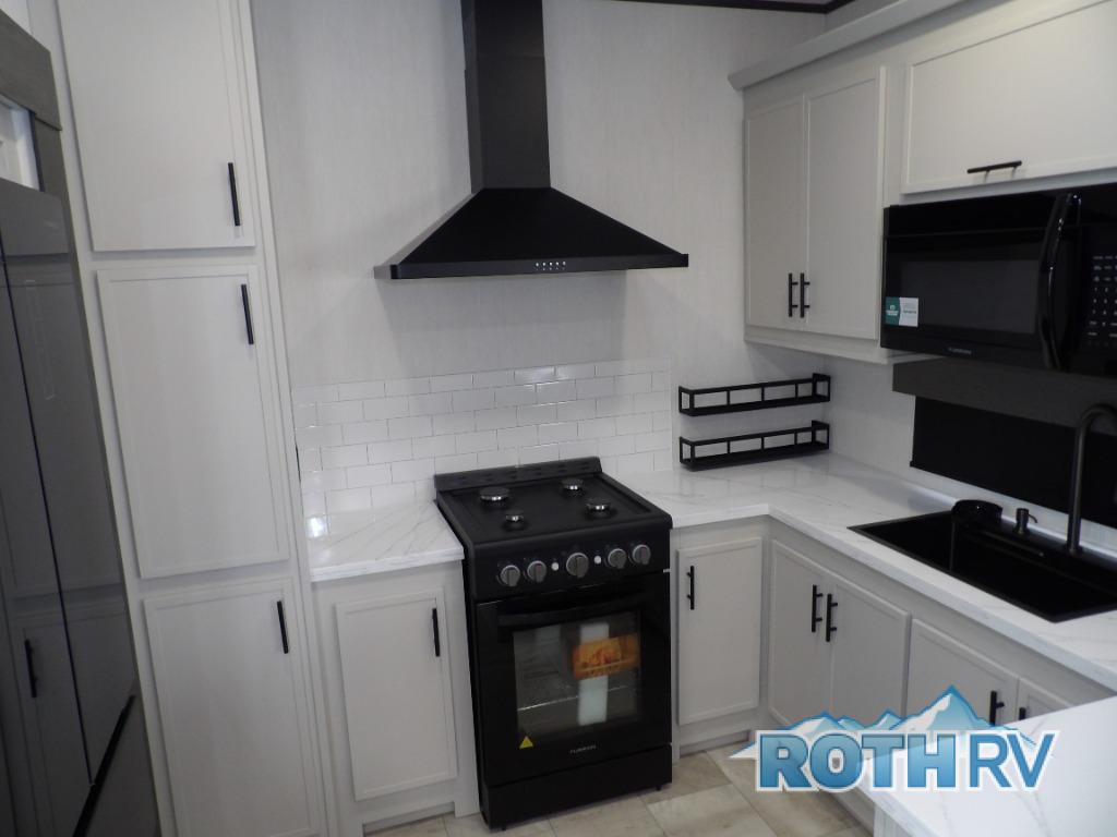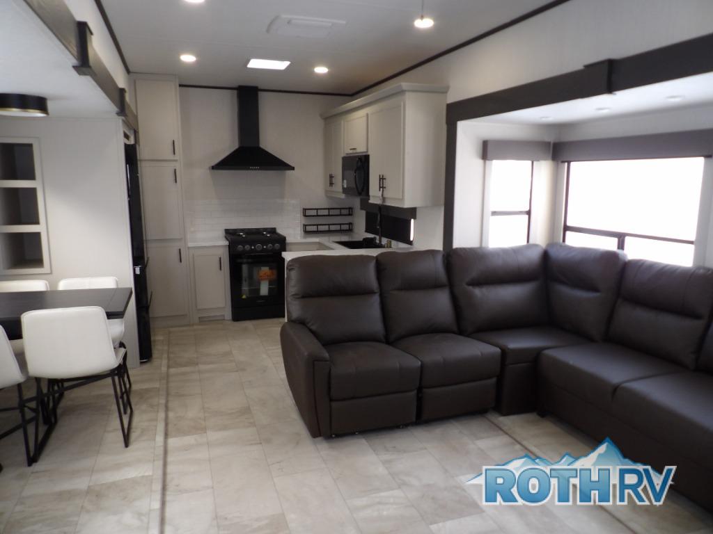 One of the standout features of the 38LAUNDRY fifth wheel is the convenient stackable washer and dryer located in the half bath, letting you take care of laundry right from the comfort of your trailer, no campground laundromat needed. After a day full of outdoor adventures, everyone can relax together in the spacious living room, which features a large sectional sleeper sofa perfect for movie nights or extra sleeping space. The equipped kitchen includes a four-burner range, giving the chef plenty of room to cook up delicious meals with ease. And when it's time to unwind, the private bedroom offers a peaceful retreat complete with a walk-through private bathroom featuring a dual vanity and a generous walk-in closet, ideal for storing all your clothes and camping gear.