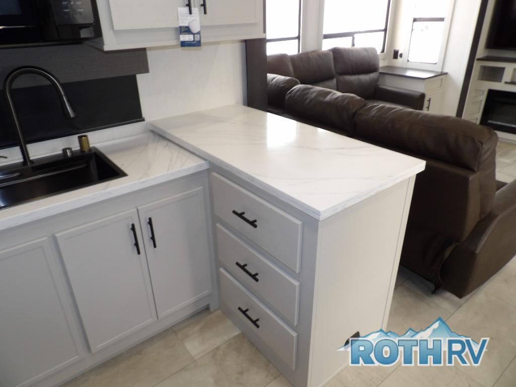 The Sanibel series stands out with a combination of unique and highly functional exterior and interior features designed for both convenience and durability. On the outside, a drop-frame pass-through storage area with a rubberized liner offers ample space while protecting your gear from moisture and wear. Setting up camp is effortless thanks to the one-touch auto-leveling system and rubberized suspension equalizer, which provide a smooth and stable foundation. Inside, comfort meets practicality with carpet less slides for easy cleaning and blackout roller shades for privacy and temperature control. The real wood cabinet doors and solid surface countertops add a touch of elegance, no matter where the road takes you.