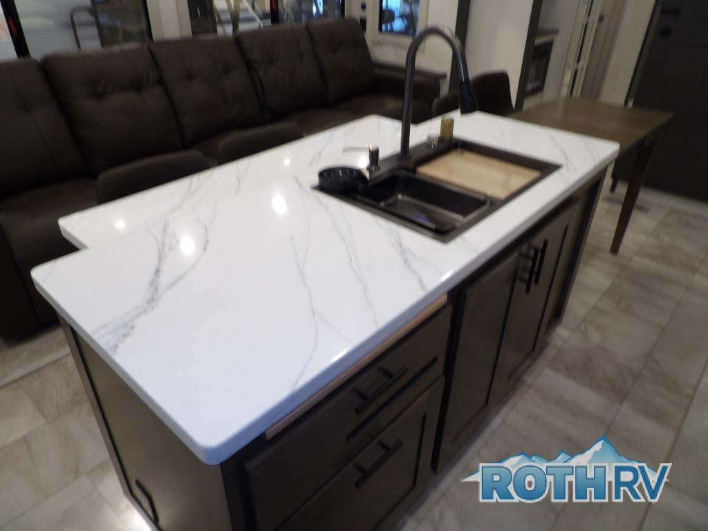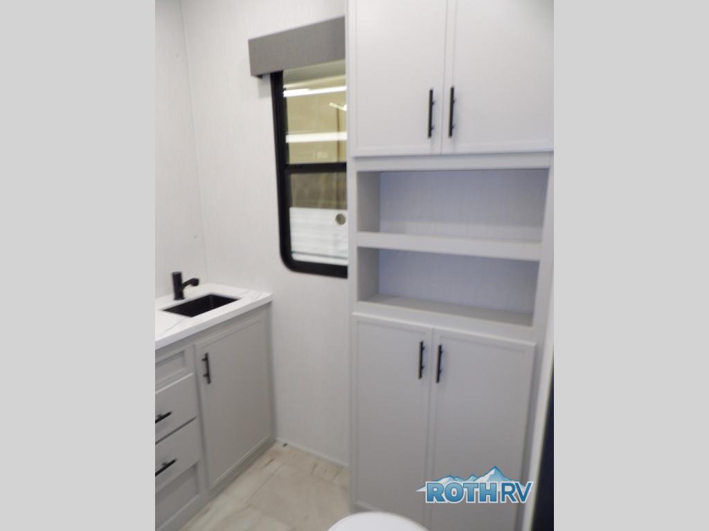The Sanibel series stands out with a combination of unique and highly functional exterior and interior features designed for both convenience and durability. On the outside, a drop-frame pass-through storage area with a rubberized liner offers ample space while protecting your gear from moisture and wear. Setting up camp is effortless thanks to the one-touch auto-leveling system and rubberized suspension equalizer, which provide a smooth and stable foundation. Inside, comfort meets practicality with carpet less slides for easy cleaning and blackout roller shades for privacy and temperature control. The real wood cabinet doors and solid surface countertops add a touch of elegance, no matter where the road takes you.