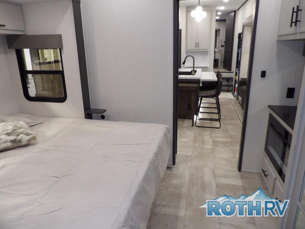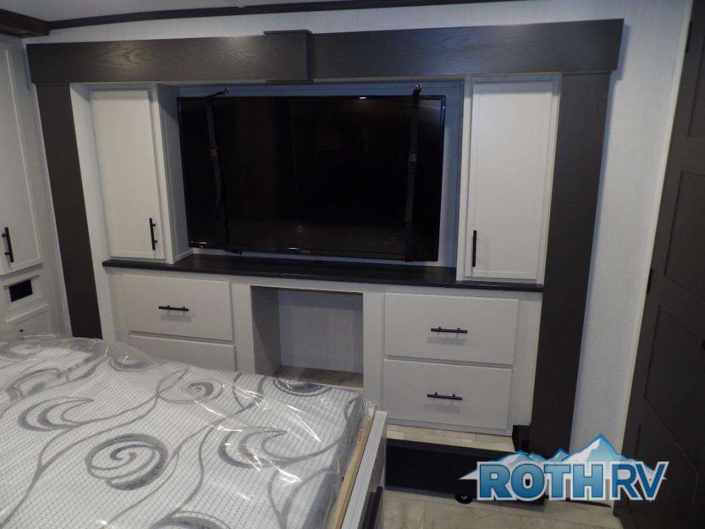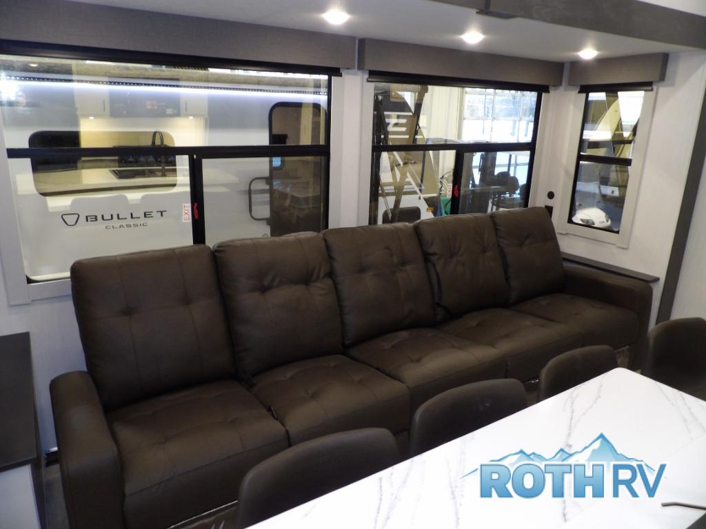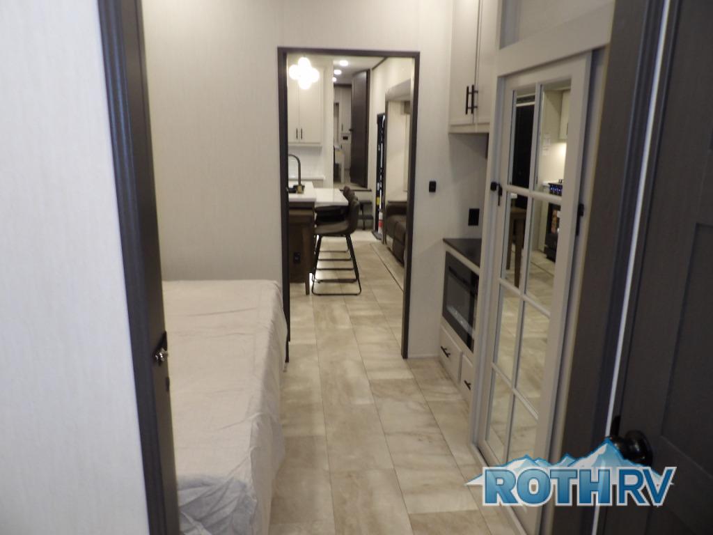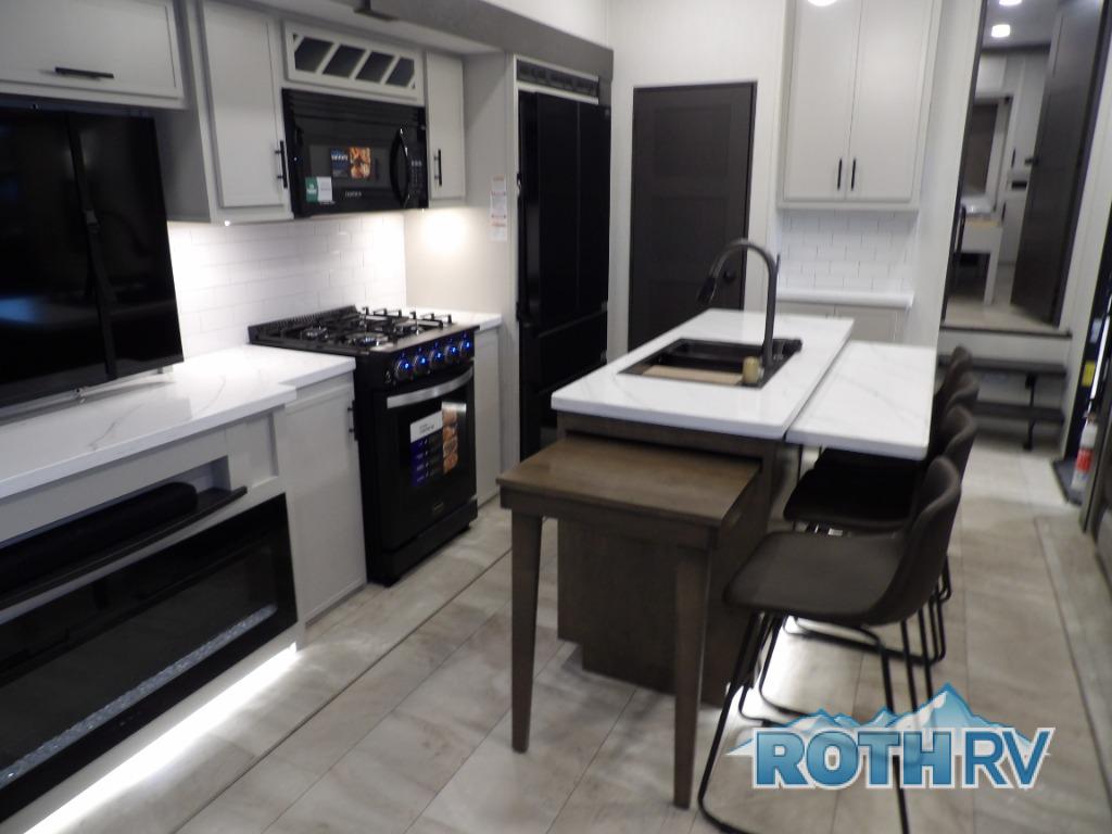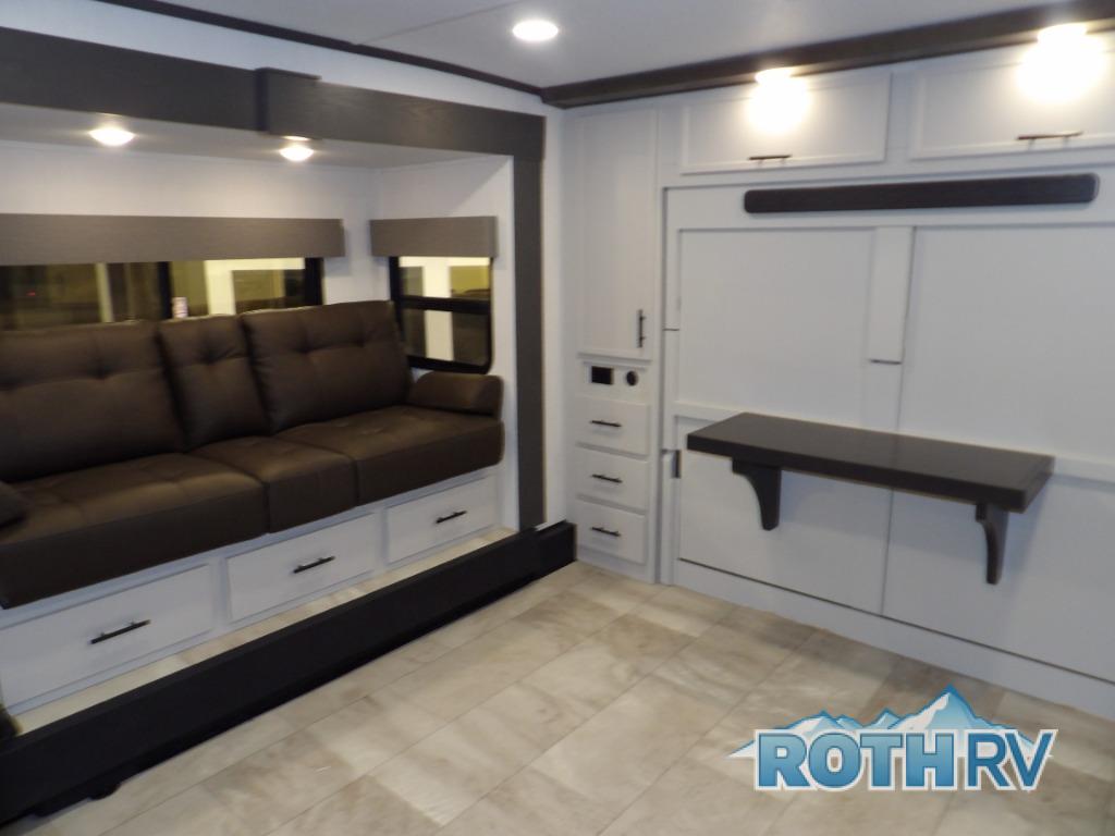 This fifth wheel offers a highly versatile layout designed to adapt to your lifestyle. The front bedroom is a flexible space featuring a sofa on a slide-out and a desk that easily converts into a Murphy bed, making it ideal as a remote office, an extra-sleeping area for guests, or even a cozy living space with a smart TV. A full bathroom is conveniently located nearby for added comfort. In the center of the trailer, you'll find a spacious living area with a five-piece sectional recliner and an expandable dinette to accommodate everyone. The well-equipped kitchen includes essentials like a four-burner range and a French door refrigerator, perfect for cooking up your favorite meals. At the rear, the master bedroom offers a relaxing retreat with a king-sized bed and direct access to a full bathroom featuring a dual vanity, bringing the comforts of home wherever you go.