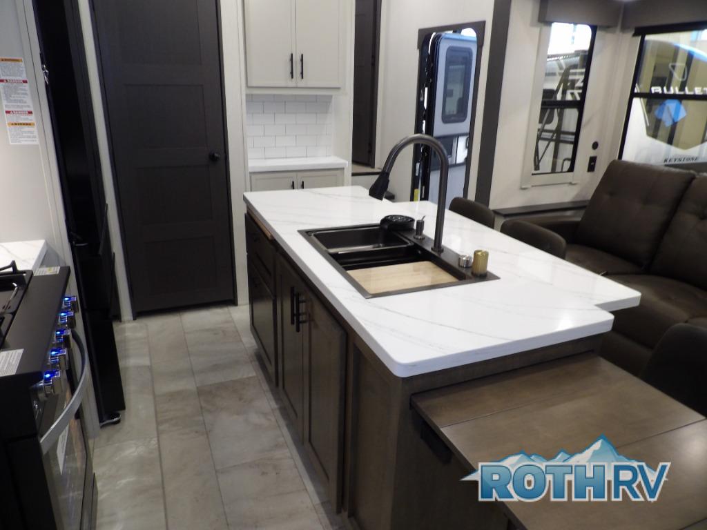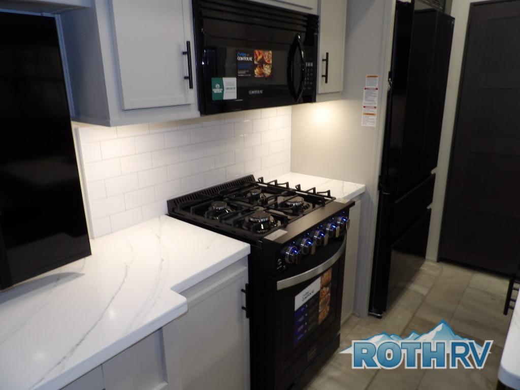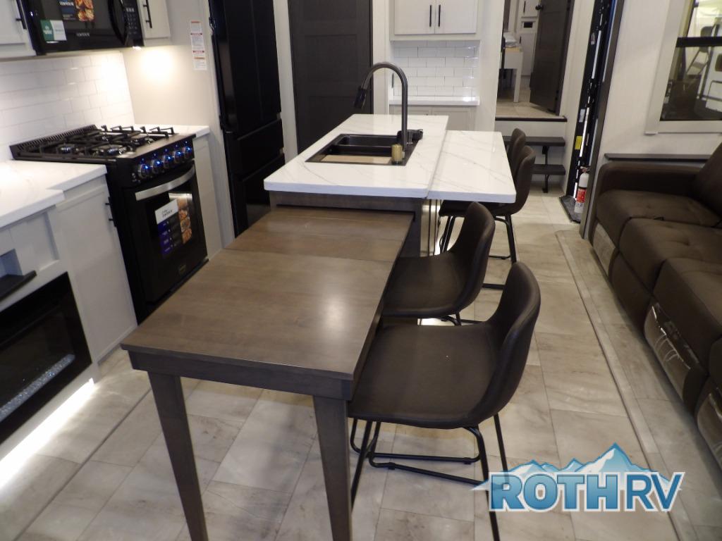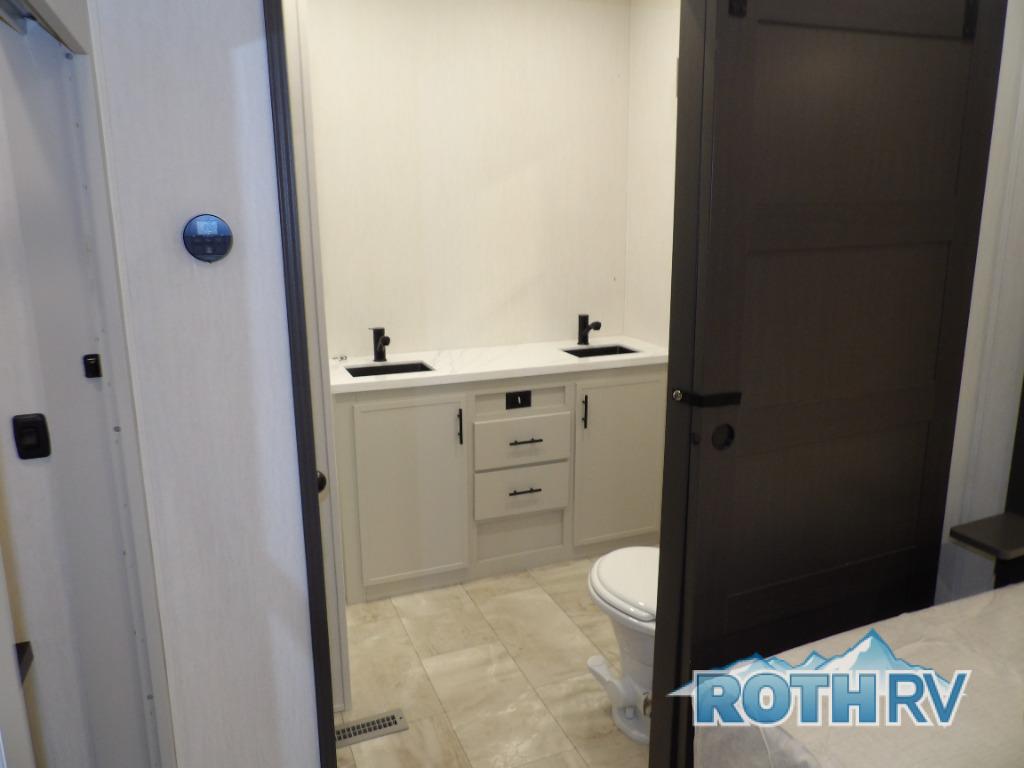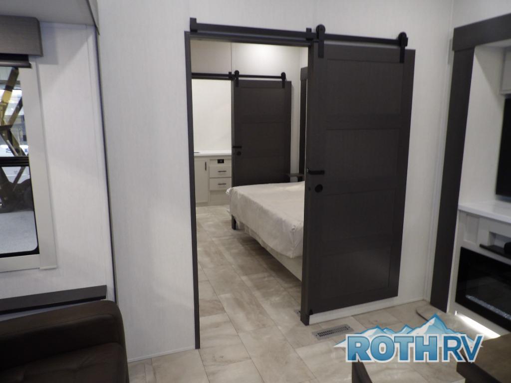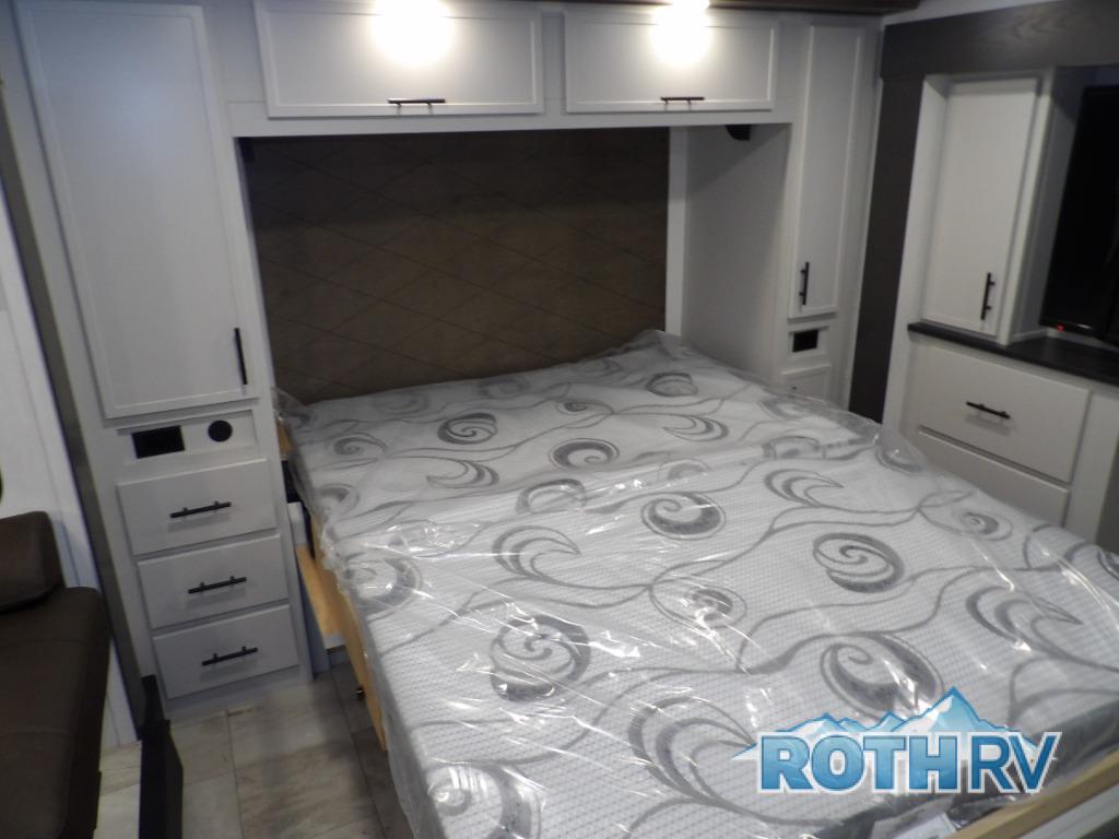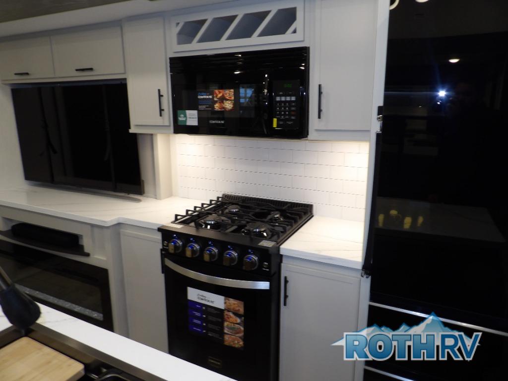 This fifth wheel offers a highly versatile layout designed to adapt to your lifestyle. The front bedroom is a flexible space featuring a sofa on a slide-out and a desk that easily converts into a Murphy bed, making it ideal as a remote office, an extra-sleeping area for guests, or even a cozy living space with a smart TV. A full bathroom is conveniently located nearby for added comfort. In the center of the trailer, you'll find a spacious living area with a five-piece sectional recliner and an expandable dinette to accommodate everyone. The well-equipped kitchen includes essentials like a four-burner range and a French door refrigerator, perfect for cooking up your favorite meals. At the rear, the master bedroom offers a relaxing retreat with a king-sized bed and direct access to a full bathroom featuring a dual vanity, bringing the comforts of home wherever you go.