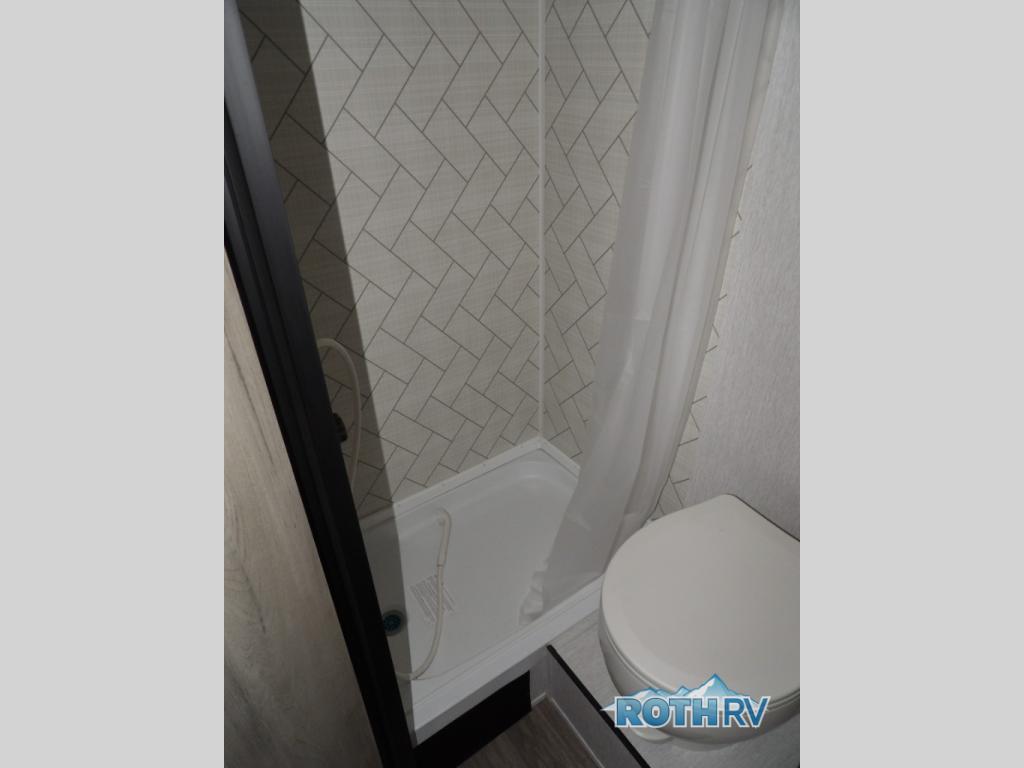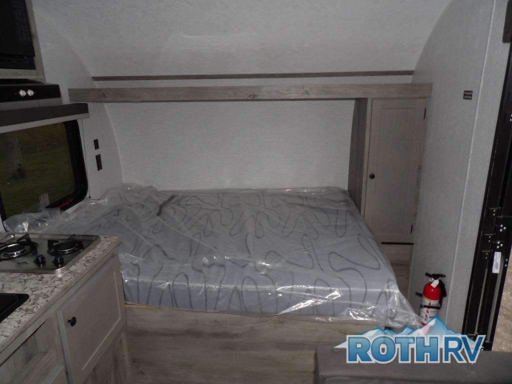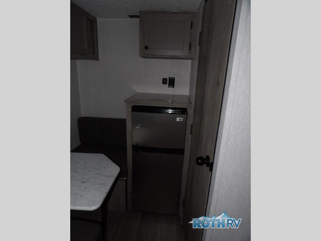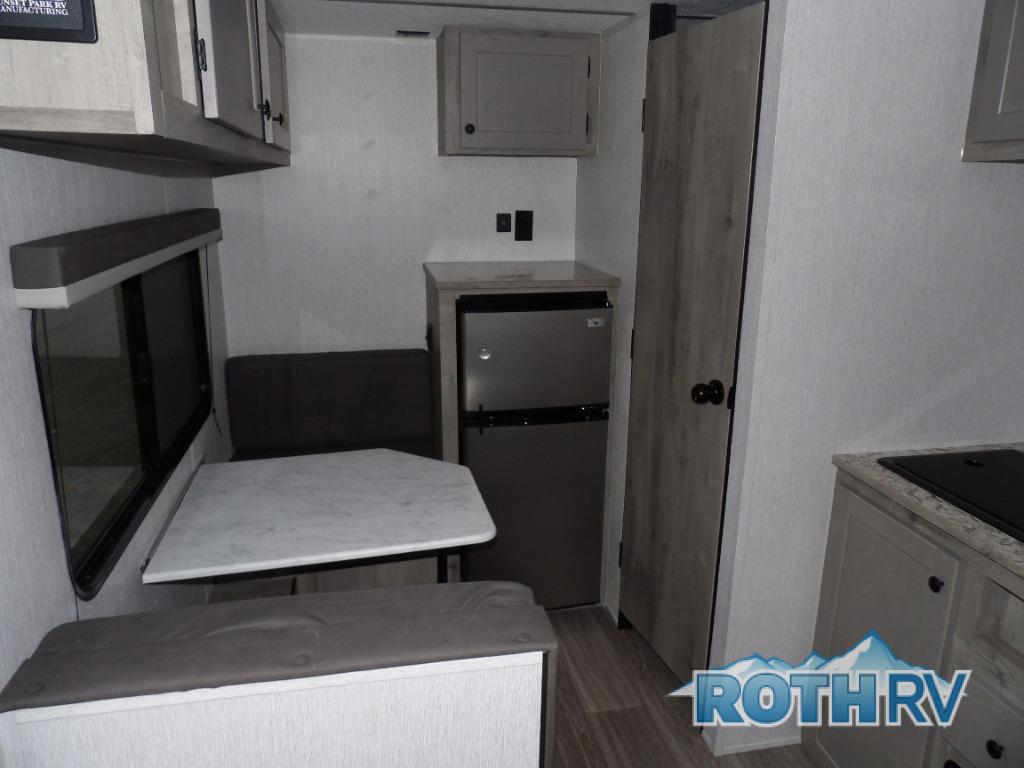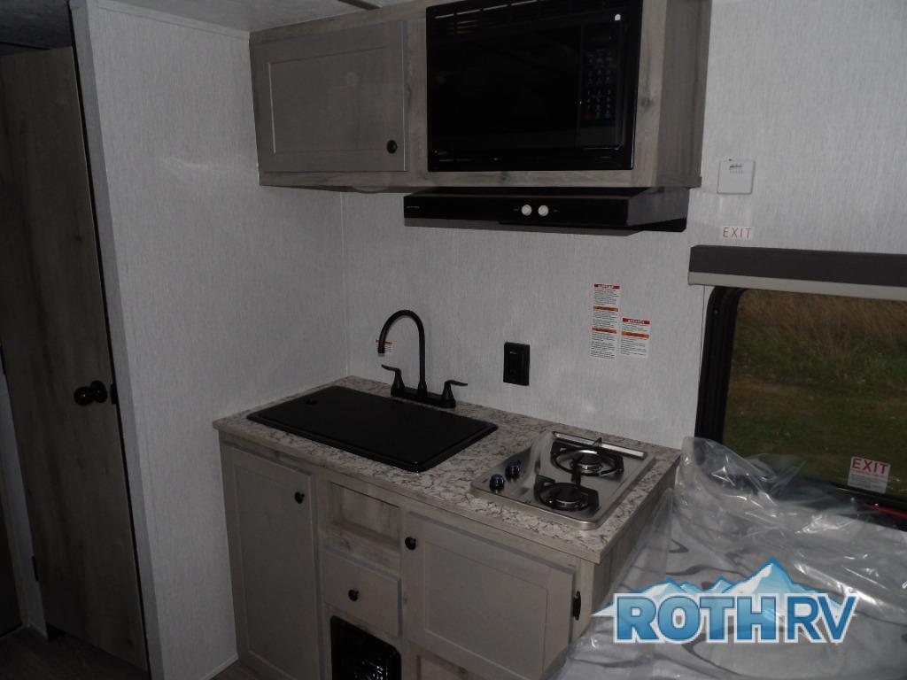 This lightweight travel trailer is perfect for two to three campers each night! You will sleep soundly on the front 54" x 74" bed with an overhead shelf and a closet for your things. Whip up eggs and bacon on the two burner cooktop in the morning, then dine at the 30" booth dinette. This can also double as sleeping space for an overnight guest or two little ones! The private bath with a 24" x 32" shower and a toilet will let you freshen up each day, and the double sink in the kitchen provides a place to wash your hands and teeth at night. You will also appreciate having a 4.3 cu. ft. 12V refrigerator to keep your food fresh and a 5K BTU wall A/C to keep you comfortable all summer long!