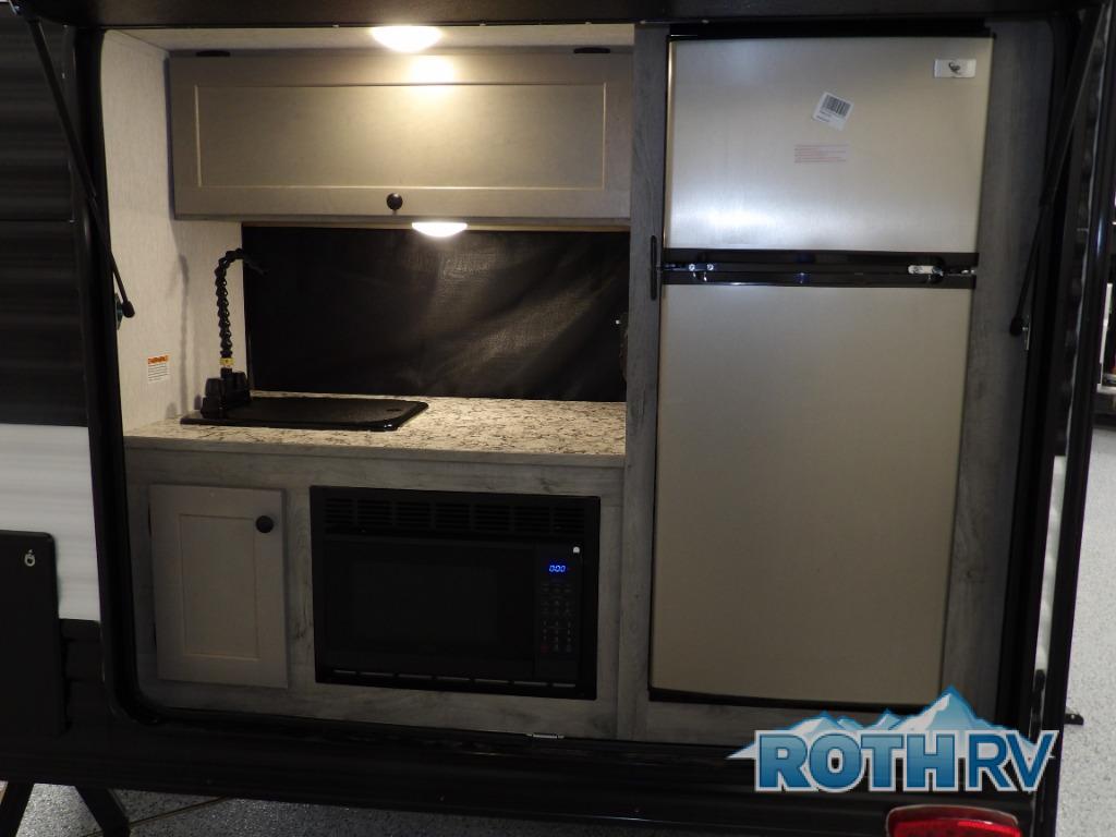 This unit is ideal for travelers seeking maneuverability and ease of towing without compromising on essential comforts. The rear closet provides convenient storage for clothing and personal items, keeping your belongings organized, and the bed assembly creates a cozy sleeping space, perfect for restful nights on the road. Practical storage and organization can be found in the front closet, which offers additional storage for travel essentials and personal belongings, while the front shelf delivers handy space for items you want within easy reach, enhancing convenience. Further, the A/C cabinet provides specialized storage for your air conditioning unit, ensuring efficient integration and protection. Convenience is met in the outdoor kitchen, which features a refrigerator, overhead cabinets, and a two-burner cooktop, providing versatile cooking options for preparing delicious meals outdoors.