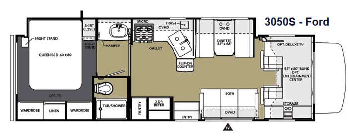 Options may include an overcab entertainment center, deluxe TV, and bedroom TV.
