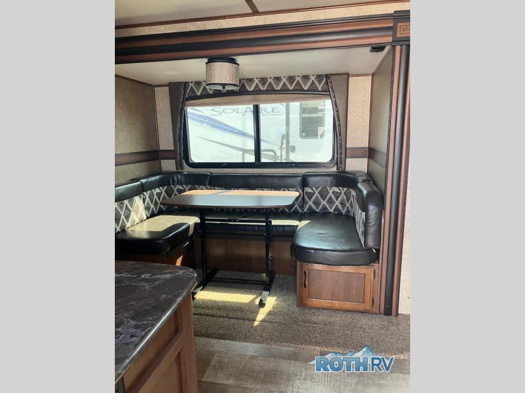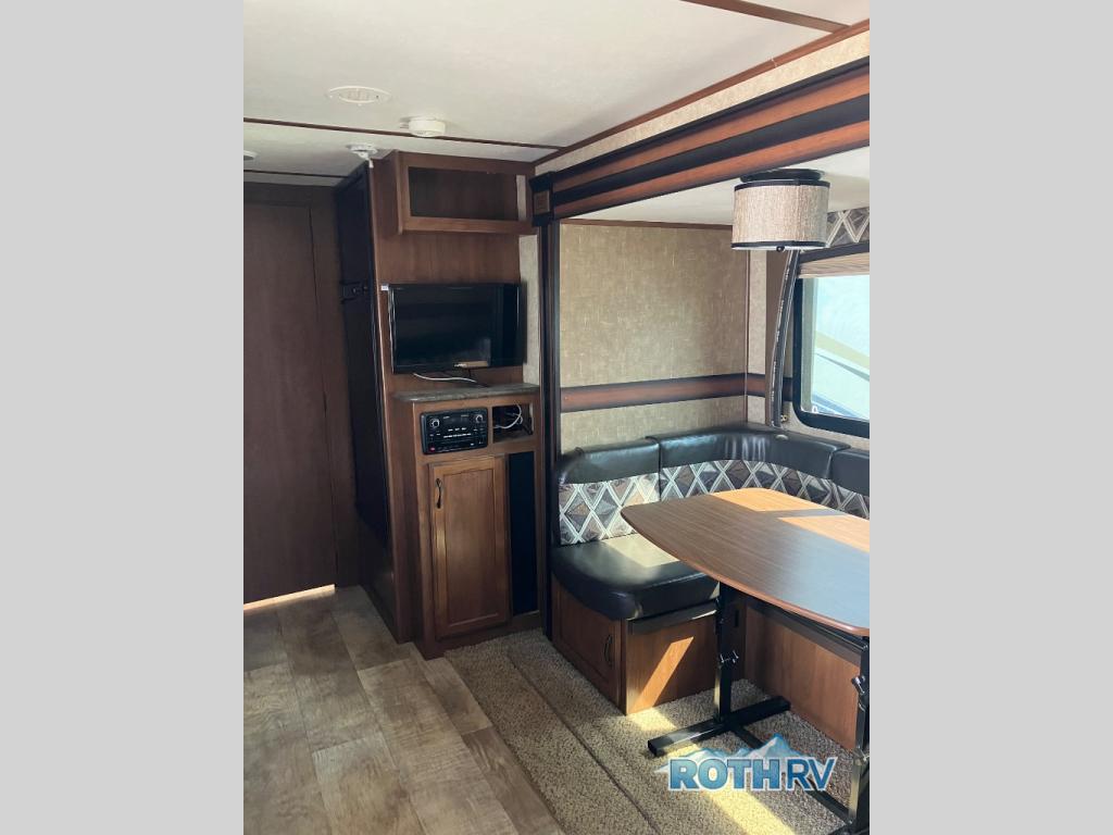 Straight in the front entry door find a slide out u-shaped dinette that offers added floor space when fully extended. The dinette is great for enjoying your meals at, and can easily be turned into added sleeping space for the kids or overnight guests. A nearby TV base can easily be viewed from the sofa, bed, or dinette.