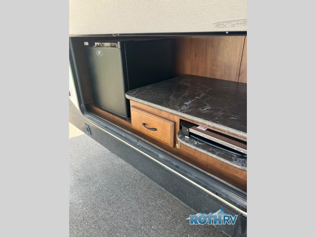 The outside kitchen features a pull-out two burner cook-top, a refrigerator, and counter space. You will also find a 13' awning to help create an outdoor living space just outside the door, plus so much more!