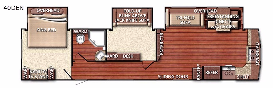 The first door on your right passed the patio door is the den, or second bedroom. Inside find a lot of space with a slide out jack knife sofa with fold up bunk above. There is a desk to the left of the door with a wardrobe in the corner.