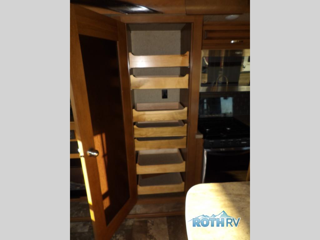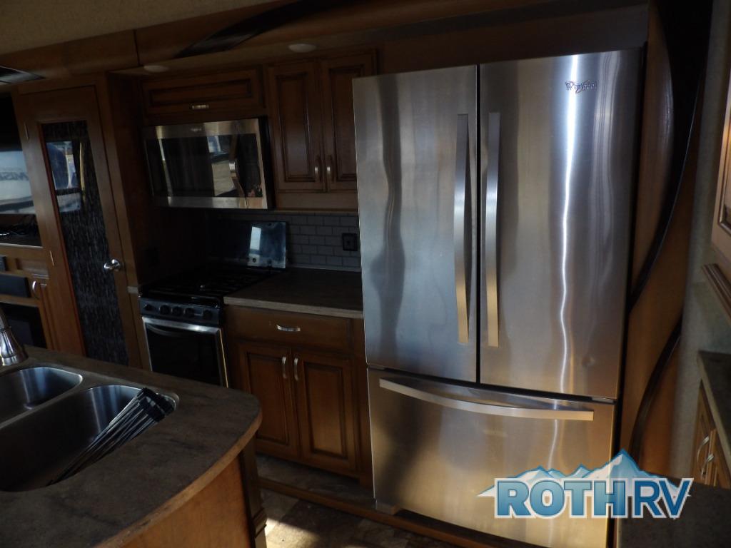 Two generous slide outs are located in the main living/kitchen area right inside the door. To your immediate left as you step inside find a slide out which offers a free standing dinette and two chairs, plus two lounge chairs. Along the rear wall you will find a sofa, plus overhead cabinets that run the entire width of the unit. Continuing around to the road side, another slide out features a fireplace and an entertainment center. This slide also features the kitchen appliances.