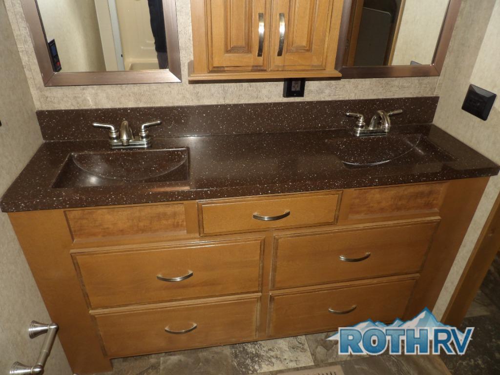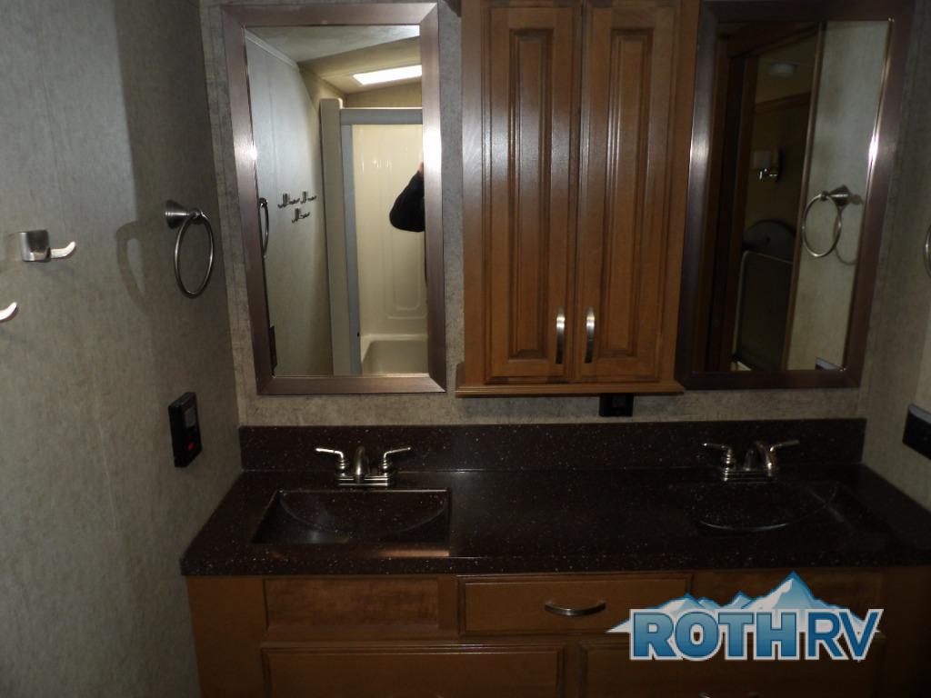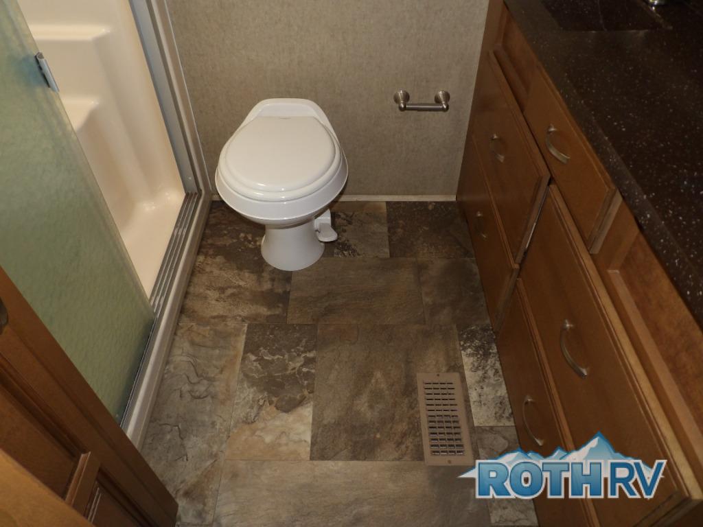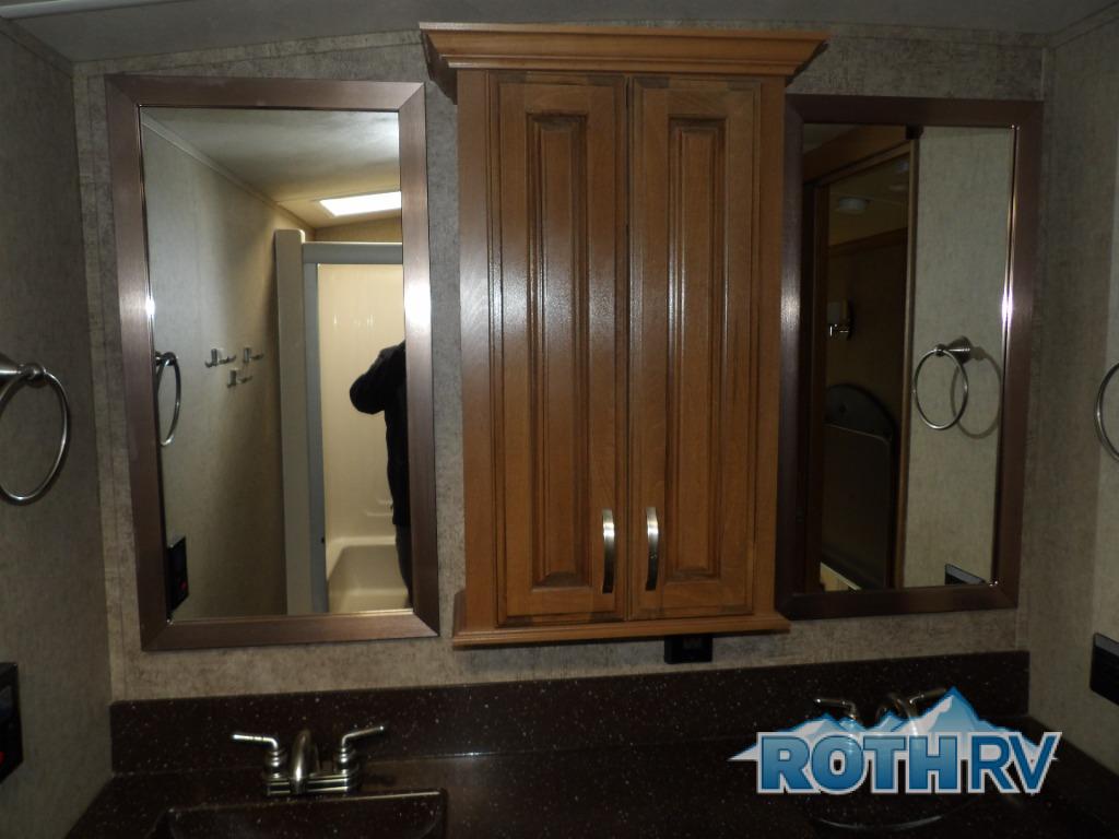 Up the steps towards the front of the fifth wheel find a full bathroom on your left. It includes a vanity with sink, a medicine cabinet, a nice size shower with seat, toilet, and overhead cabinet.