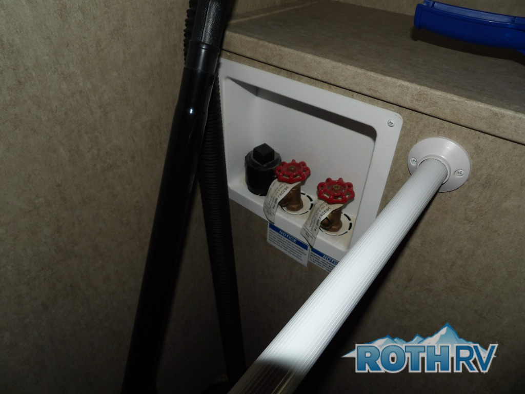 The private front bedroom offers a queen bed slide out with a shelf on either side, or you can choose an optional king size bed if you need a bit more sleeping space. There is also a dresser opposite of the bed along the curb side wall, and a full width wardrobe with shelves and drawers for all of your storage needs. In corner of the wardrobe you will find that it has been washer/dryer prepped for your convenience, plus so much more.