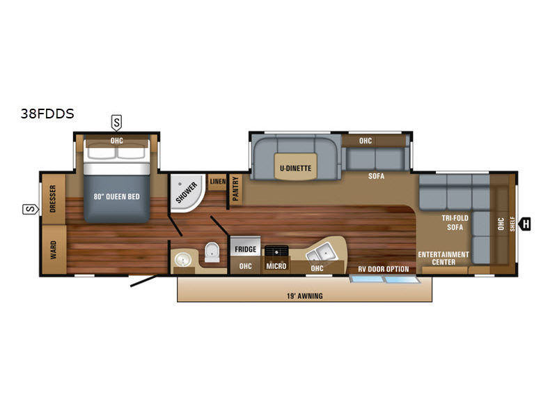You will surely enjoy everything you find in this Jay Flight 38FDDS travel trailer. The owners will have their own master bedroom with a second entry door as they walk through the full bathroom from the kitchen and living area. The patio door allows more sunlight to come inside, plus provides an amazing view of the great outdoors. You will find the large L-shaped tri-fold sofa is perfect for reading a book, watching the entertainment center, and visiting with the cook in the family. You can stock up on perishables thanks to the 18 cu. ft. refrigerator, and dry goods with all the storage. Come see how this Jay Flight fits your family's lifestyle, plus you may choose a option or two to make this the perfect trailer for you!