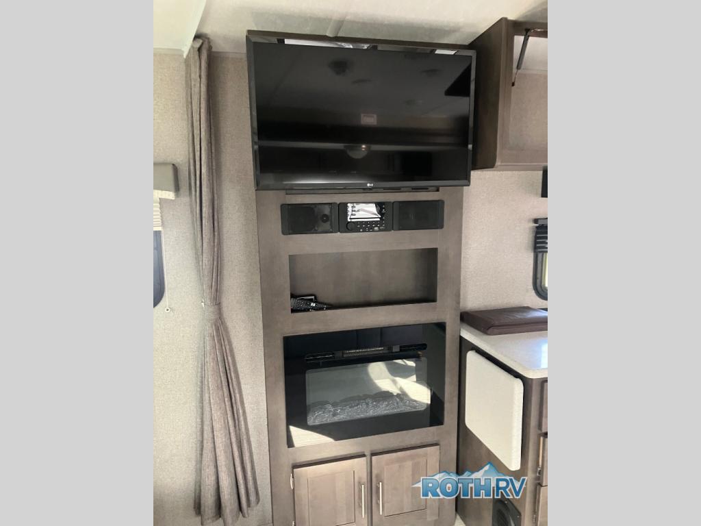 it's time to ditch that old tent and upgrade to this comfortable travel trailer. You will enjoy sleeping off of the floor on a queen bed, plus there are dual wardrobes for your clothes. There's no need to use the camp's facilities since this model includes a full bath, complete with a linen closet and shower skylight. The chef of the family will love preparing meals in the kitchen on the three burner cooktop, and there is a pantry to store dry goods and snacks. You and your spouse can get comfortable on the slide out theater seat that sits directly across from the entertainment center and fireplace!