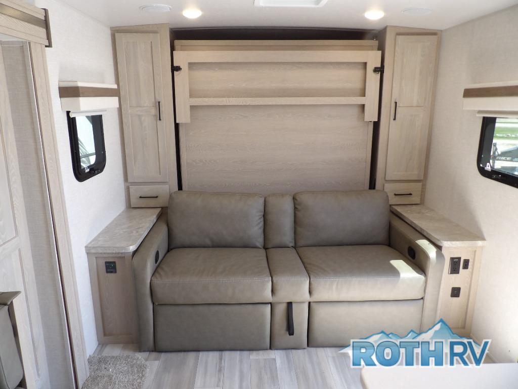 Finally, a lightweight travel trailer with double-size bunks for the kids or your guests! You'll find the versatile Murphy bed up front will be super convenient when you need more space to move around, and the 72" sofa will provide comfy seating space when the bed is put up. This model also includes a U-shaped dinette slide perfect to dine around, play games, and sleep additional guests. An LED TV in the main living area will allow you to watch your favorite shows in the evenings, or you may just find yourselves outdoors under the 18' power awning with LED lights. And check out the pass-through storage, plus additional exterior storage for your hiking gear!