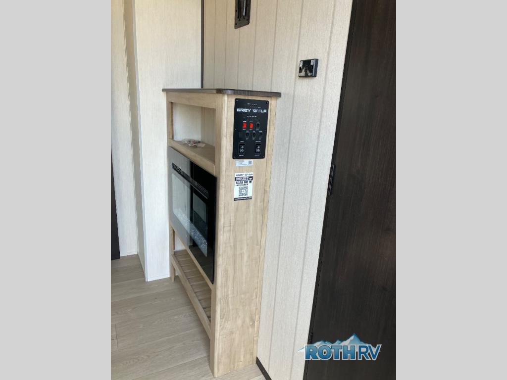 This Cherokee Grey Wolf travel trailer has some of the best accommodations for your group! First of all, it provides you with two entry doors so that everyone can come and go as they please. And before you even reach the interior, you will find that this trailer has an outdoor kitchen all ready for your summertime picnics. Once you do finally make your way to the interior, you'll find that the fireplace creates a beautiful living space next to the sofa and U-shaped dinette. You will also appreciate having a large pantry so that you can stock up on the food your family loves. The double-size bunks have a ladder for easy climbing, and the private bedroom has an RV king bed for easy relaxing.